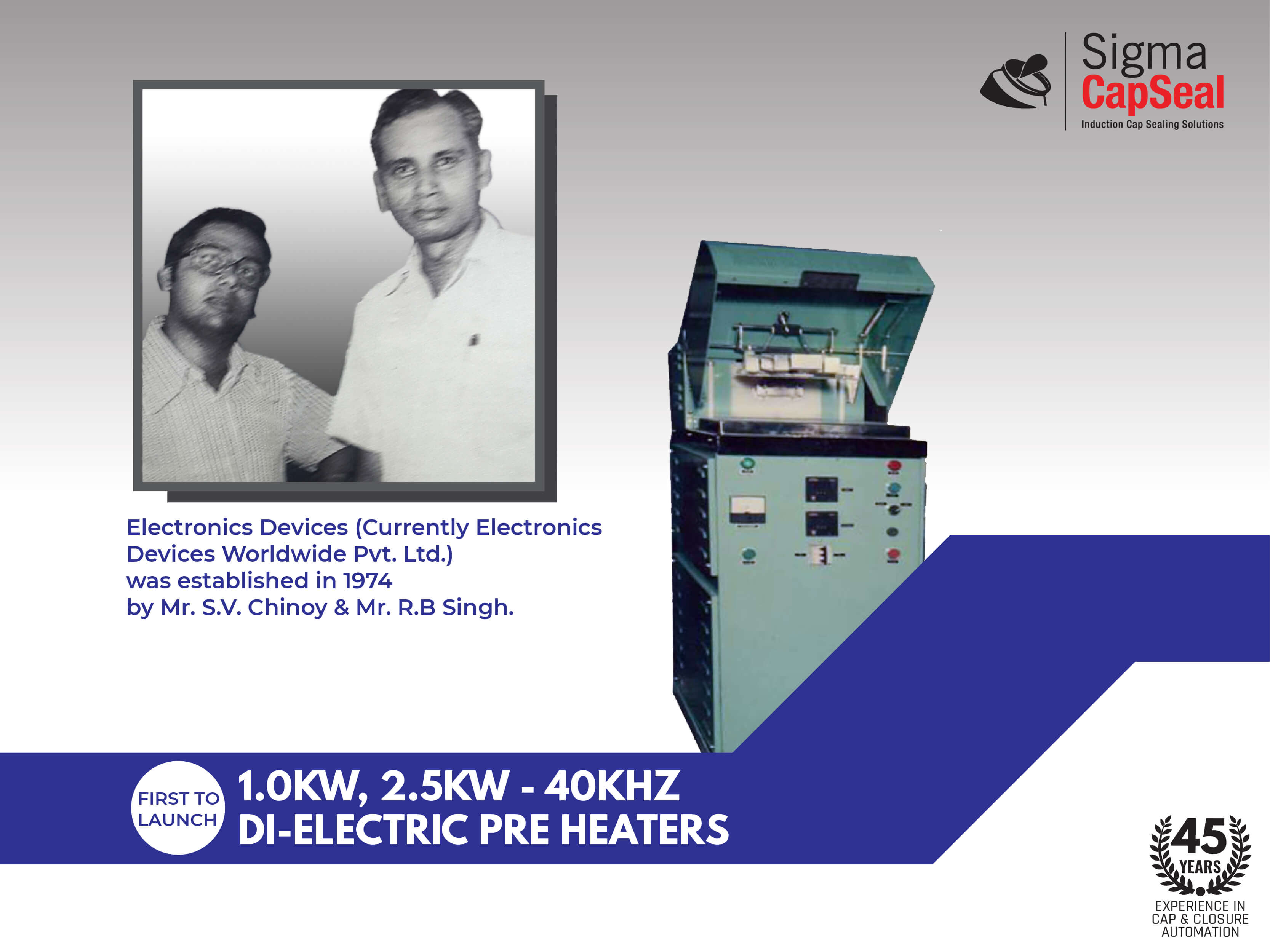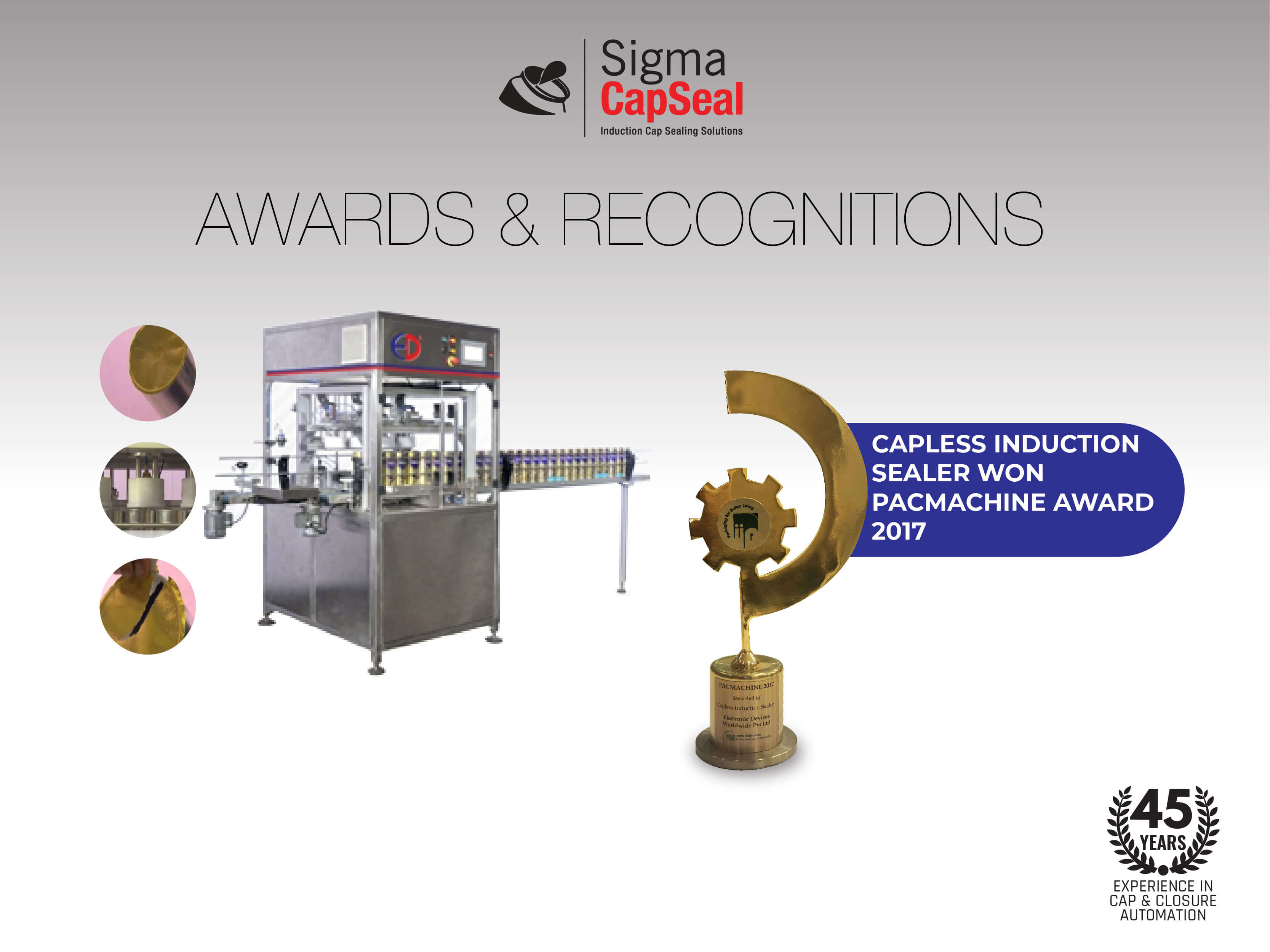 Established in 1974 in a mere 100 sq.ft facility, today in 4 decades Sigma CapSeal has grown to having manufacturing facilities in Mumbai, Vasai, Umbergaon and USA totaling to over 1,00,000 sq.ft. Our Sales & Service centers are located in Mumbai, Delhi, Bengaluru, USA, Africa, Europe & Australia etc. with sales spanning to over 80 countries.